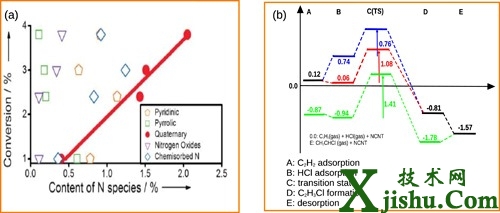研究表明在碳納米管催化劑中摻雜氮原子是催化劑優(yōu)異催化活性的關(guān)鍵。通過氮摻雜,碳納米管催化劑表現(xiàn)出了和傳統(tǒng)金屬催化劑(例如銅)相近的催化能力,摻氮碳納米管的反應(yīng)轉(zhuǎn)換頻率高達(dá)2.3×10-3 s-1,具有很好的工業(yè)應(yīng)用潛力。更為重要的是摻氮碳納米管催化劑還具有優(yōu)異的穩(wěn)定性,而在長時間反應(yīng)條件下大部分金屬催化劑都表現(xiàn)出了催化活性的大幅降低,因而碳材料催化劑的穩(wěn)定性是保證未來工業(yè)上應(yīng)用的關(guān)鍵。通過比較不同氮物種的作用,發(fā)現(xiàn)季氮物種的含量和反應(yīng)活性呈現(xiàn)較好的正比例關(guān)系。結(jié)合密度泛函理論計算,證明了季氮物種是主要催化活性位點。更進(jìn)一步的理論計算揭示了在碳材料催化劑上的反應(yīng)路徑,證明乙炔吸附是反應(yīng)中最重要的步驟,摻雜氮原子增強了乙炔分子在活性位上的吸附,進(jìn)而提高了催化活性。通過電子結(jié)構(gòu)分析發(fā)現(xiàn)了乙炔分子在碳材料上的吸附機理和在金屬催化劑上的是截然相反的。這是因為氮摻雜改變了催化劑的酸堿性從而影響了反應(yīng)分子和催化劑之間的作用形式。這些研究成果表明納米碳材料作為一類重要的非金屬催化劑材料具有廣闊的應(yīng)用前景,并且為高效、綠色生產(chǎn)聚氯乙烯開辟了新的研究方向。