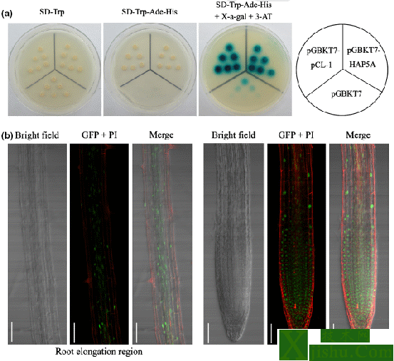 AtHAP5A在酵母細(xì)胞中具有轉(zhuǎn)錄激活活性(a)并定位于細(xì)胞核(b)