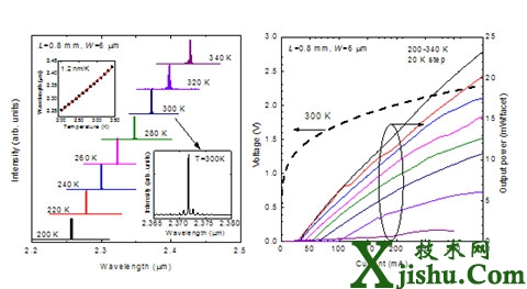 2.4微米InP基無銻激光器在不同溫度下的激射光譜和輸出功率曲線