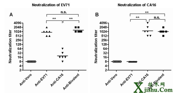 中國科學(xué)院上海巴斯德研究所蔡一村博士在研究員黃忠的指導(dǎo)下,開展了抗EV71和CA16雙價疫苗的研發(fā)工作。研究人員制備了基于滅活病毒的單價EV71疫苗、單價CA16疫苗和包含以上兩種抗原的雙價疫苗,并在小鼠模型上評價單、雙價疫苗的免疫原性和抗病毒效果。結(jié)果顯示,單價疫苗所誘導(dǎo)產(chǎn)生的抗體只能夠抵抗同型病毒的體外和體內(nèi)感染,而對于異型病毒沒有保護效果;雙價疫苗免疫小鼠血清在體外可以有效中和EV71和CA16兩種病毒,并且保護小鼠免于致死劑量的EV71或CA16病毒攻擊。研究表明,實驗性雙價疫苗中的EV71和CA16抗原間不存在免疫競爭和拮抗,能夠在動物體內(nèi)平衡地誘發(fā)針對EV71和CA16的有效免疫保護反應(yīng)。