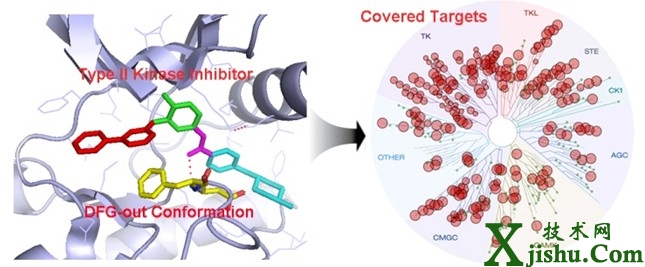 此外,雖然激酶在理論上都存在著非活化狀態(tài),及DFG-out構(gòu)型,但到底哪些激酶擁有可以被II型藥物靶向的這種DFG-out類型構(gòu)象并不是很清楚。研究團隊根據(jù)小分子藥物的選擇性實驗結(jié)果反向研究了這一問題,分析認為大約220多種激酶可能擁有此種構(gòu)型,這為藥物化學(xué)工作者進一步開發(fā)II型激酶藥物分子指明了具體的靶點群。此外,團隊所提出的系統(tǒng)性開發(fā)II型激酶藥物設(shè)計方法為大規(guī)模開發(fā)此類抑制劑鋪平了道路。