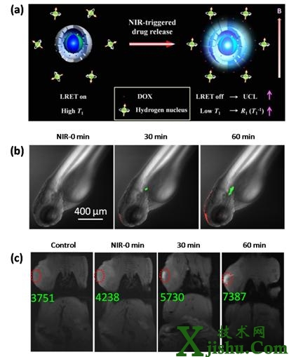 (a)UCL/MRI雙模式成像同時(shí)監(jiān)控藥物釋放原理;斑馬魚(yú)(b)及SD大鼠(c)水平的藥物釋放實(shí)時(shí)監(jiān)控效果