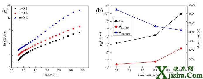 (a) 復合陶瓷材料lnρ與1000/T的關系圖; (b) 電阻率及B值隨x量變化曲線圖