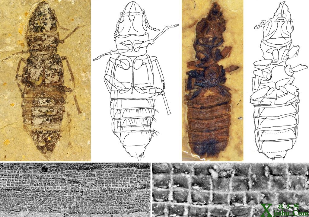 圖1 早白堊世巨須隱翅蟲(上)和腹部節(jié)間膜“磚墻構(gòu)造”(下)