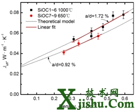 圖2 不同熱解溫度(1000 ºC 、650 ºC)制備的SiOC大孔陶瓷室溫表觀熱導(dǎo)率隨密度變化關(guān)系